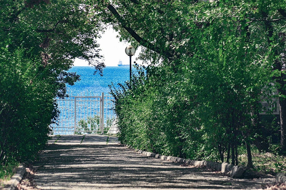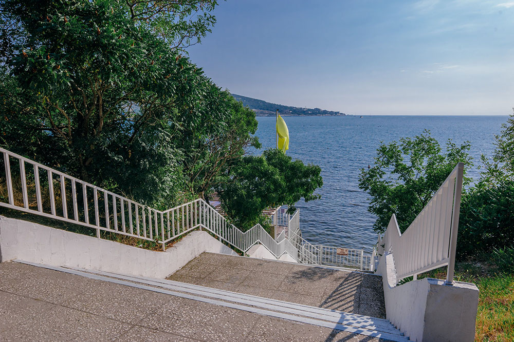 Визитная карточка лагеря - пляж в 10 метрах от лагеря. В распоряжении детей галечный пляж в окружении пышной субтропической растительности. Для комфортного отдыха на море пляж оборудовали деревянными настилами, теневыми навесами, а также удобными спусками в воду. На пляже постоянно дежурят спасатели и медицинский работник. Купание детей в огороженной буйками зоне.